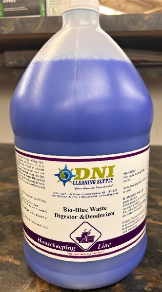 Bio-Blue is an excellent non-toxic formaldehyde-free holding tank deodorizer for R.V.’s, boats, airplanes and busses. It is a biologically active liquid formulated with a blend of selected micro organisms and enzymes. Its digestive enzymes are environmentally safe and biodegradable while providing excellent breakdown of organic waste and eliminating odours. This product can also be used for applications such as waste degrading in septic tanks and controlling odours and digesting waste in outhouses and portable toilets.